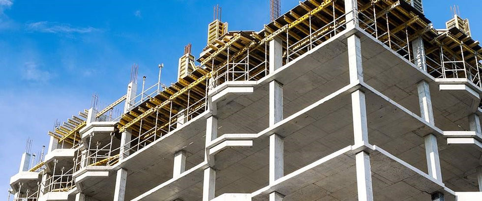 Images depicting the construction process, including steel framing, concrete building, and wooden framing under construction.